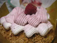 | タルトの上に苺を載せ、さらにその上にスポンジ生地が載っている。なぜかこの生地はバナナの味がしたけど、たぶんほかのものだと思う。このタルトはしっとりフンワリ系で、その辺りがダニエルらしい気がする。これは苺の味を楽しむ一品。 | |
