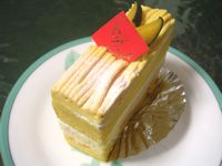 黄色と白色のスポンジの鮮やかなコントラストが印象的。黄色のフワフワのスポンジは、かぼちゃの香りがしっかりとしている。 また、このコントラストが、スポンジの味を単調にすることなく味にアクセントをつけており、最後まで楽しめるようになっている。上のかぼちゃクリームは、甘さは控えめ。全体的に、かぼちゃの味が前面に出されており、素材のの味が大事にされていると感じさせる。 |